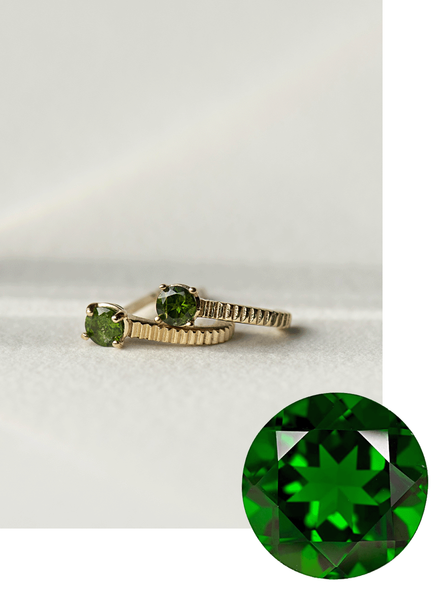 The vibrant green colour is reminiscent of the more commonly known emerald and this is no coincidence as both stones owe their colour to the element 'chromium’.
