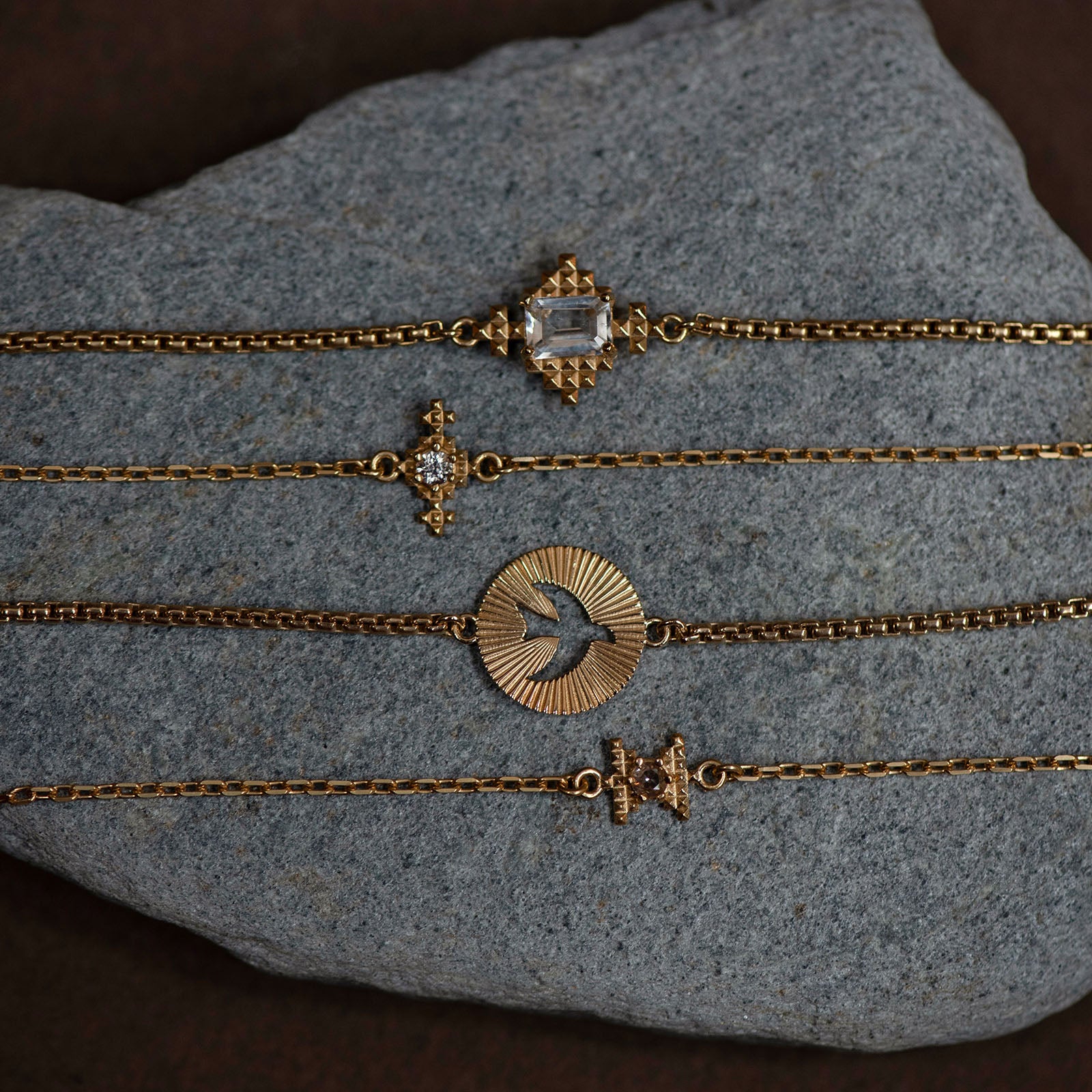 Drawing from reflections on childhood and teenage years at Moonbird, our beloved family jewellery shop run by our father Douglas. This is where values of community, nature, and quality craftsmanship were instilled. Re-imagined symbols such as the Om, Yin Yang, and Ankh, pivotal to our upbringing, now form the heart of this collection, symbolising keys to life and embodying the spirit of an era known for its carefree charm.