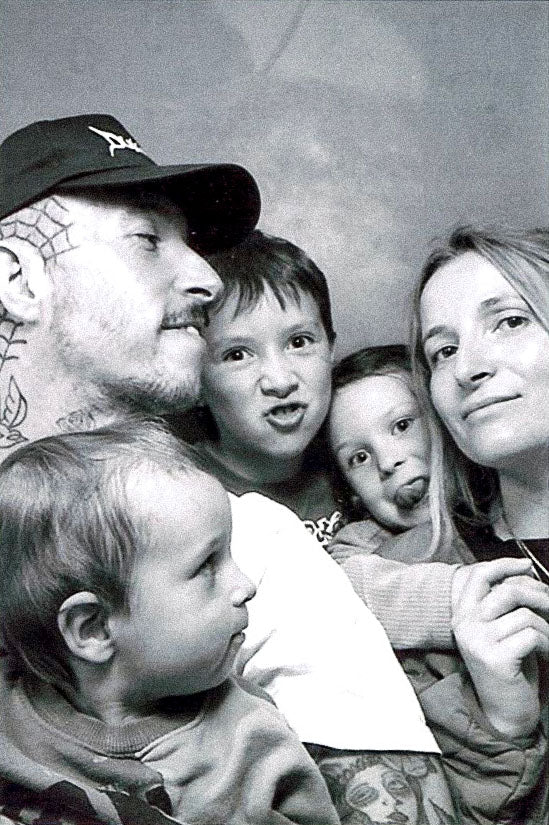 Then, almost five years ago now, I met my partner Laurie, who already had two small children – Bart, who was three, and Summer, who was one. Their biological mother had died from cancer too. The journey we have all been on as a family has been just as colourful and chaotic as the family I was born into. It’s been challenging, heart expanding, triggering, blending and full of love. A cosmic coincidence: Laurie and I went to the same art college, but we never spoke, not once. We were in the same year, and I do remember him, like a warm, blurry figure in the far distance, but our paths never crossed back then. The timing wasn’t right. Now here we are, almost a decade later, the five of us. Bart and Summer asked if they could call me mummy just as I fell pregnant with my son, Phoenix, so I became a mother before I had even given birth. Life, as always, takes many unexpected turns.