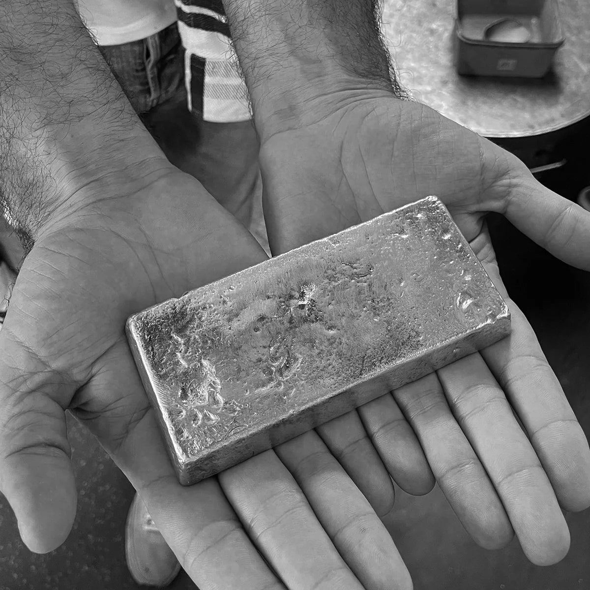 We melt down and reuse the metals, continuing the journey and crafting new pieces from the refined alloy (recycled materials).