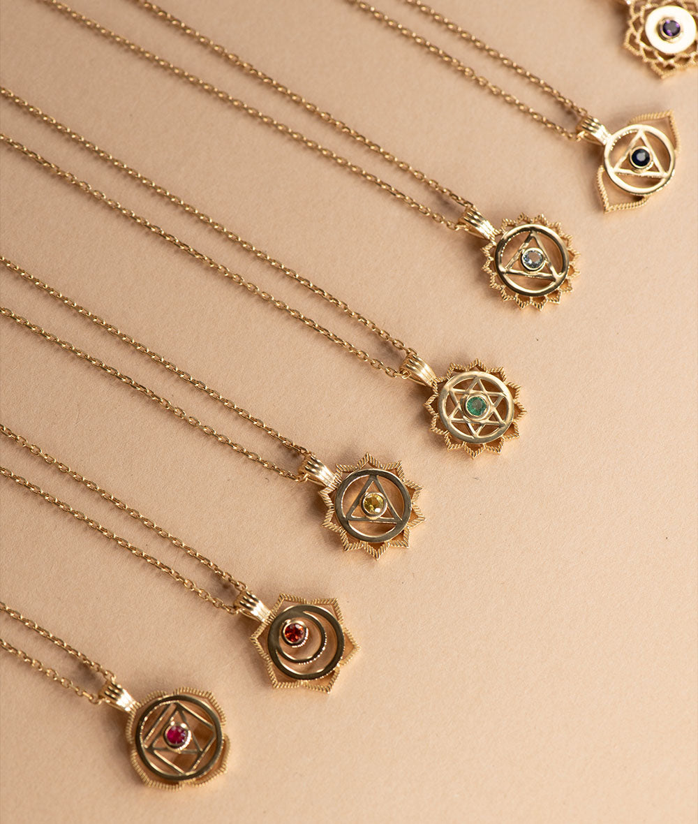 Our Intuition Chakra Necklace is a reminder to trust your own wisdom. This handcrafted pendant, with a bezel set Blue Sapphire, features the sacred symbol of the Ajna, or Third Eye Chakra, which when open, allows us to move forward in life, making clear decisions.